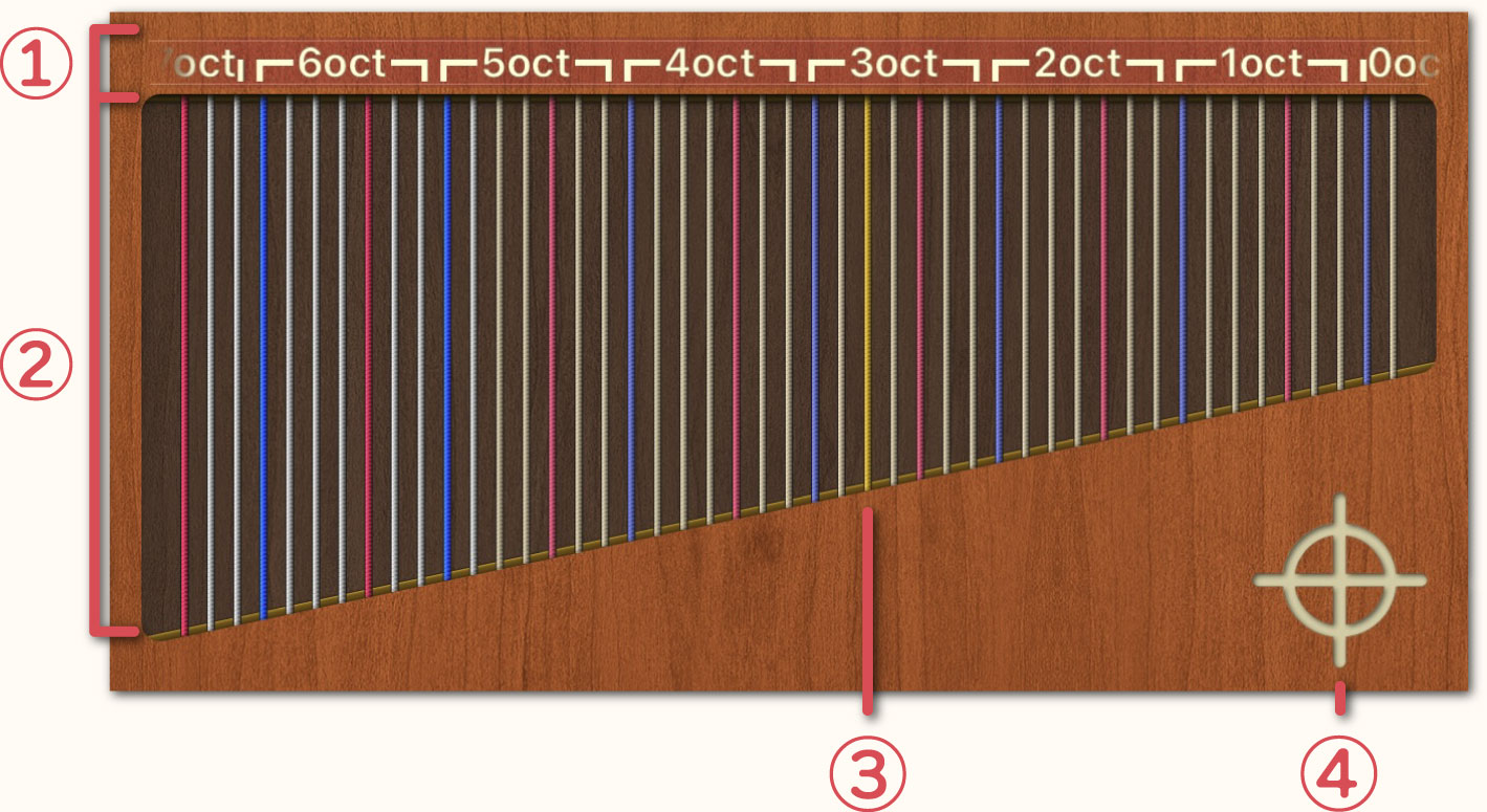 ルーラーは「ハープ」スタイルと「スタンダード」スタイルの2種類から選べます。変更は設定画面の【音名スタイル】で切り替えます。こちらの表記は「ハープ」スタイルです。