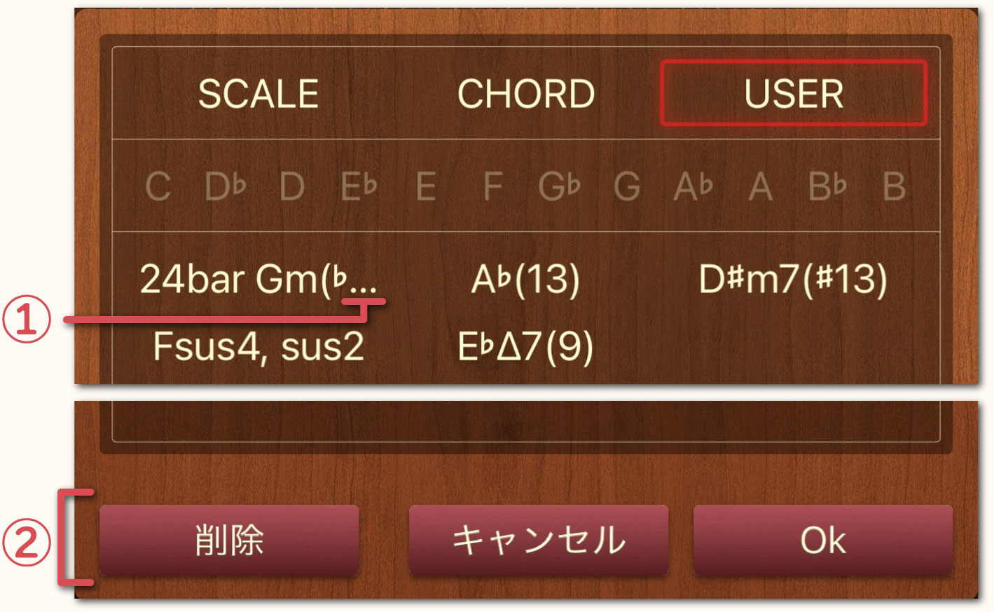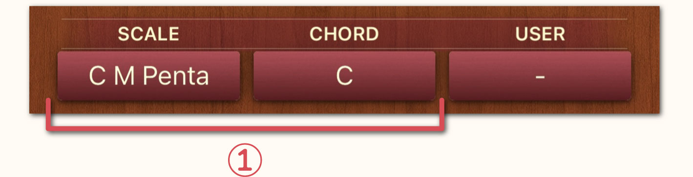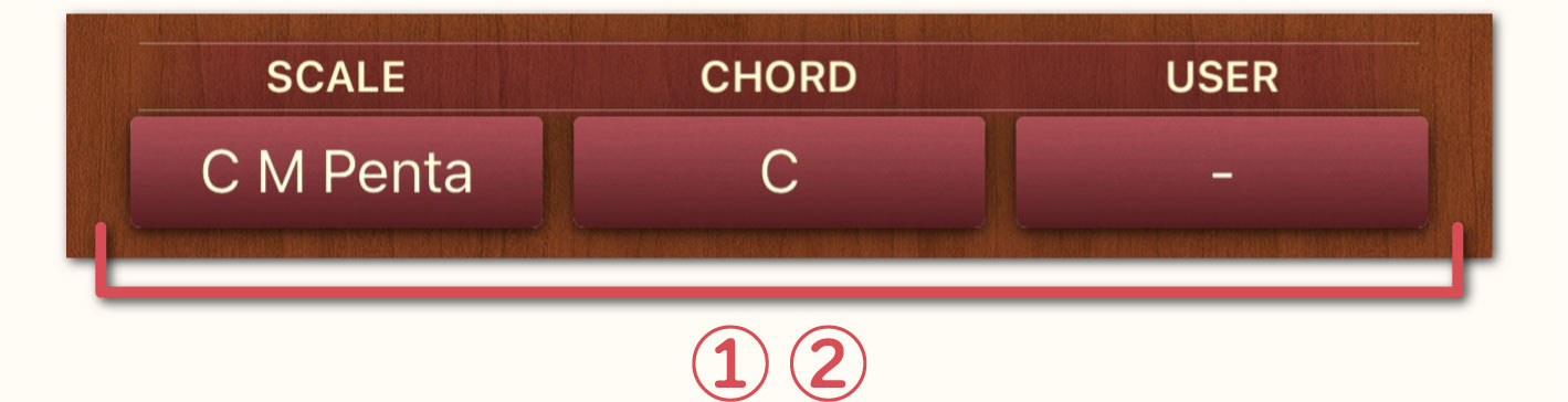 ウインドウの上部にあるタブをタップすることにより「SCALE」、「CHORD」、「USER」の切替が可能です。