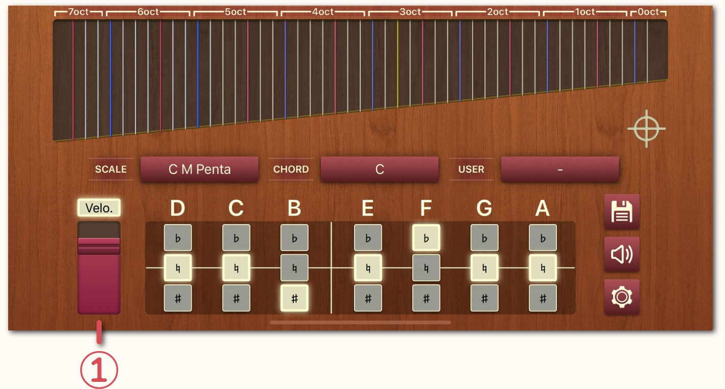ベロシティスライダーは「サイドビュー・プレイモード」時にのみ表示され、演奏中に上下へ操作することでリアルタイムに演奏の強弱を調整できます。さらに、このベロシティ情報は MIDI 接続された外部機器にも出力されます。