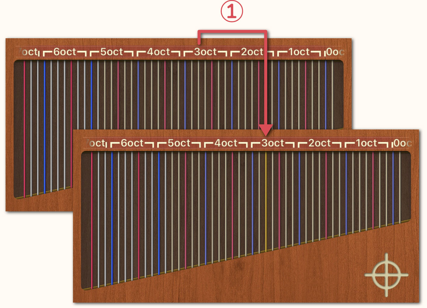 設定画面の【3rd oct. Aの弦】を無効にすると黄色弦が通常の弦の色に変わります。